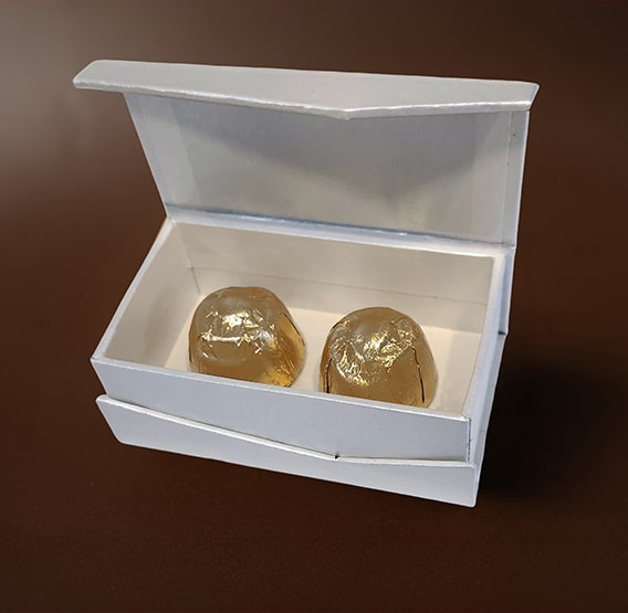 קופסא מלבנית לבן שנהב מנצנץ ממותגת לשישה פרליני שוקולד חלב "כדור" (באנץ').